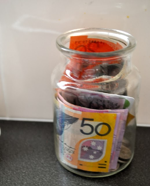 Under the "Our Home" chart is our money jar. A constant reminder to put all spare change in there, not spend unless we need to and it has helped my kids learn more about money.